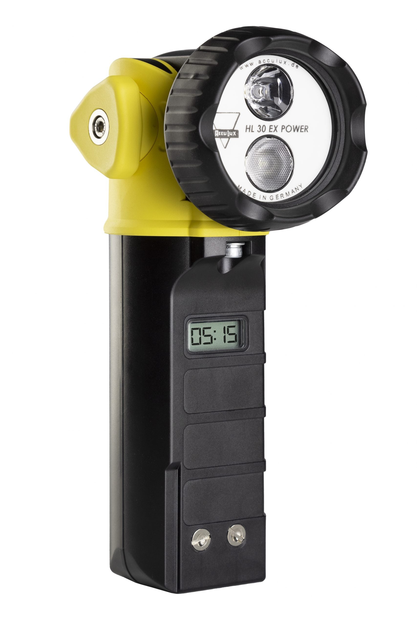 Die mikroprozessorgesteuerte, wiederladbare Knickkopf-Sicherheitshandleuchte, Modell HL 30 EX POWER mit Digitalanzeige, ATEX-Richtlinie 2014/34/EU und relevanten EMV-Vorschriften geprüft, hat eine KFZ-Zulassung. Die Leuchte ist mit zwei umschaltbaren Hochleistungs-LEDs bestückt und als Powerlicht schaltbar. Der eingesetzte umweltfreundliche Lithium-Ionen-Akku ohne Memory Effekt ist durch das intelligente Schaltungslayout tiefentladegesichert und dauerladbar. Dieser kann vom Anwender selbst getauscht werden. Aufgrund des 180° Grad schwenkbaren, verstellbaren Leuchtkopfes ist die Leuchte flexibel einsetzbar. Durch eine Klammer kann die Leuchte auch an der Schutzkleidung befestigt werden. Der Einsatz als Leuchte mit Notlichtfunktion ist ebenso vorhanden und kann vom Kunden abgeschaltet werden. Die Ladeeinheit für 100-230V AC, 12V DC und 24 V DC können von 1- bis 5-fach geliefert werden. Mit einem geringen Gewicht von ca. 0,6 kg liegt die HL 30 EX POWER an der Spitze vergleichbarer Handleuchten. Die Ausführung ist gemäß DIN 14649.