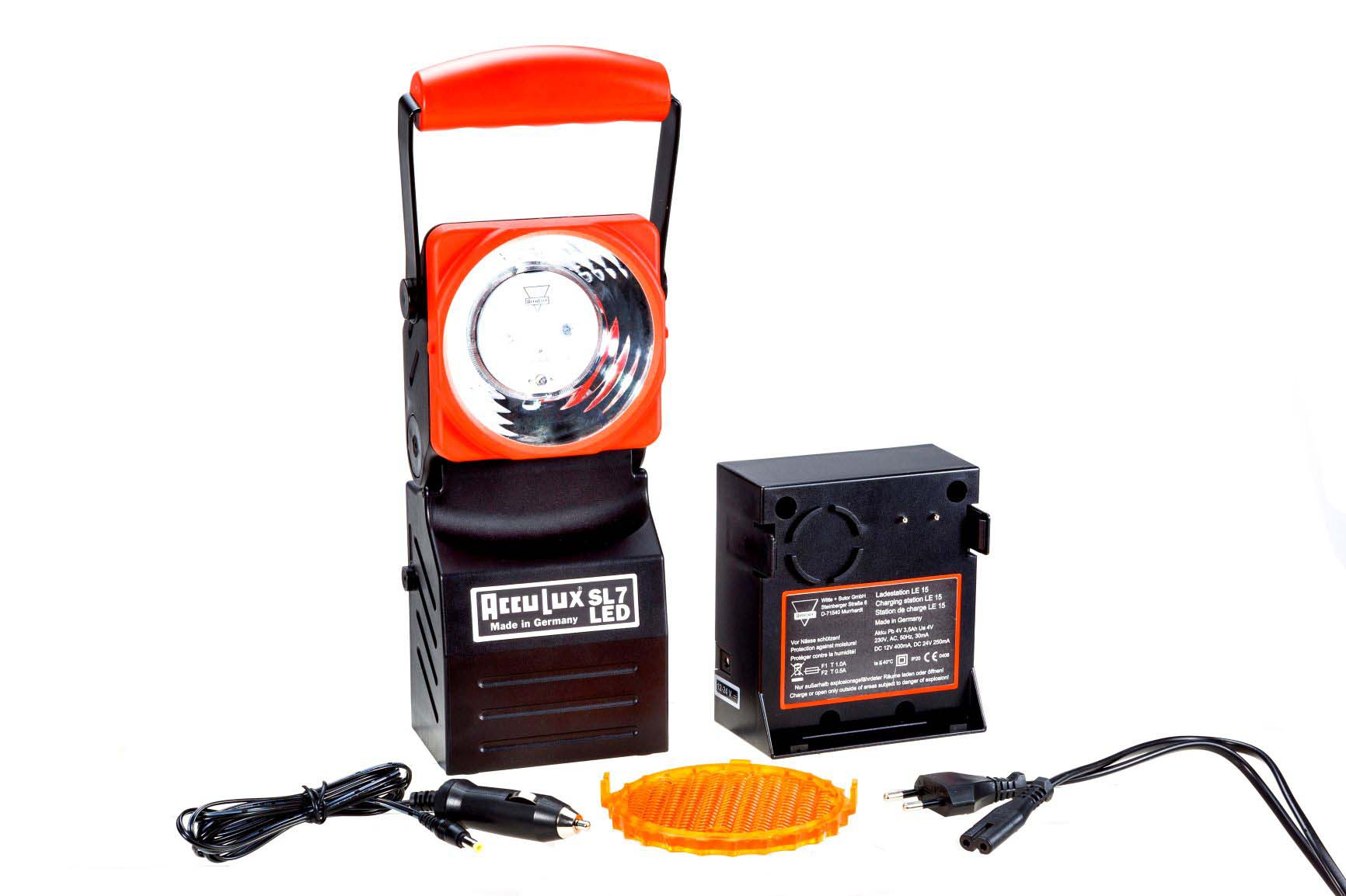 Lieferumfang: Leuchte, Ladestation, Netzkabel 230 V, Autoladekabel 12/24 V, Streuscheibe orange
