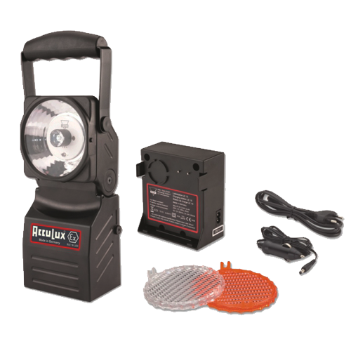 Der mikroprozessorgesteuerte, wiederladbare Handscheinwerfer, Modell AccuLux EX SLE 16 LED Set, aus schlagzähem, hochwertigem Kunststoff wurde nach Richtlinie 2014/34/EU und relevanten EMV-Vorschriften geprüft und hat eine Kfz-Zulassung. Die Linsenoptik der Power LED erzeugt einen stark fokussierten Lichtstrahl mit hoher Leuchtweite. Ein Austausch der LED-Leuchtmittel ist nicht erforderlich. Der eingesetzte umweltfreundliche Blei-Gel Akku ohne Memory-Effekt ist durch das intelligente Schaltungslayout tiefentladegesichert und dauerladbar. Durch den 110° schwenkbaren Leuchtkopf und den zusätzlich abklappbaren Leuchtengriff ist die Leuchte flexibel einsetzbar. Die AccuLux EX SLE 16 LED kann in Dauer-, Blink-, und Pilotlampenfunktion betrieben werden und als Warnleuchte eingesetzt werden. Die Ladestation verfügt über optimierte Ladetechnik in minimalen Abmaßen, wodurch Montagemöglichkeiten für kleinste Lücken im Kfz-Bereich oder Gebäude für 230 V AC sowie 24 / 12 V DC bestehen.