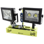 Das Kabel lässt sich praktisch im Gestell verstauen. Die Zapfen lassen sich mit einem Schnellspanner in der Breite verschieben, damit ist die Scheinwerfertrage für nahezu alle Flutlichtstrahler geeignet.