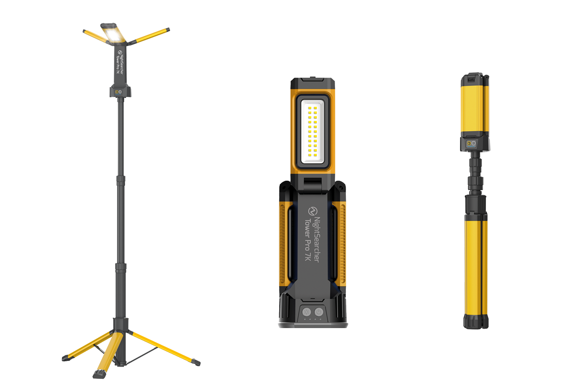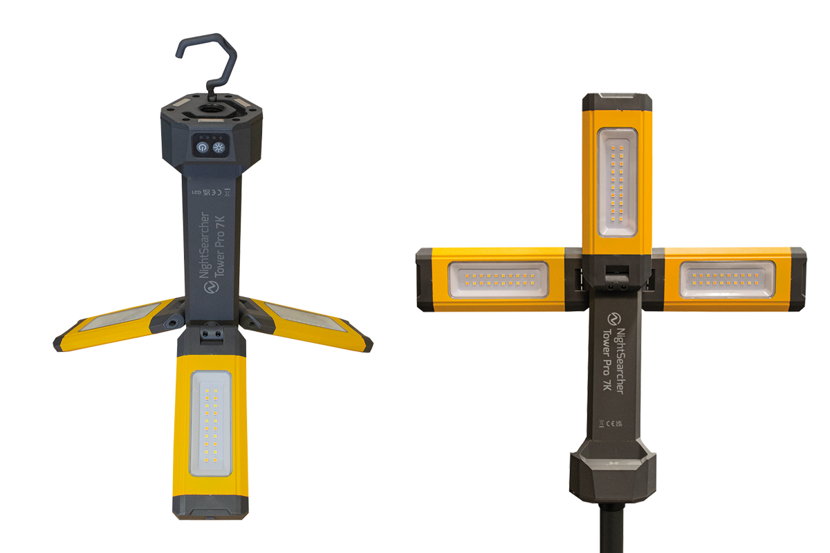 Der NightSearcher Tower Pro 7K ist ein tragbares Hybrid-Flutlicht, das über seinen eingebauten Lithium-Ionen-Akku oder über das Wechselstromnetz für den kontinuierlichen Betrieb bei längeren Einsätzen betrieben werden kann.