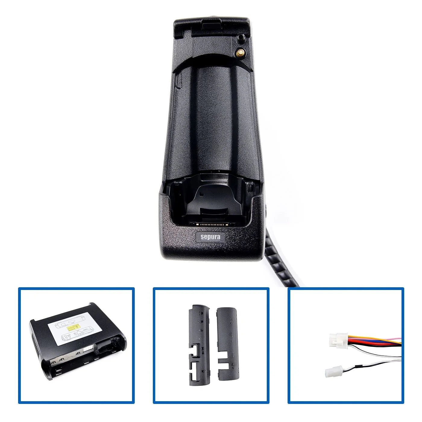 Gerätehalterung (300-00796) mit 2m Anschlusskabel, BNC-Antennenanschluss und AMPS-Kippwinkel, Anschaltbox 300-00646 (SPR-03369) mit 2 Abdeckblenden, Stromversorgungskabel (064886)
