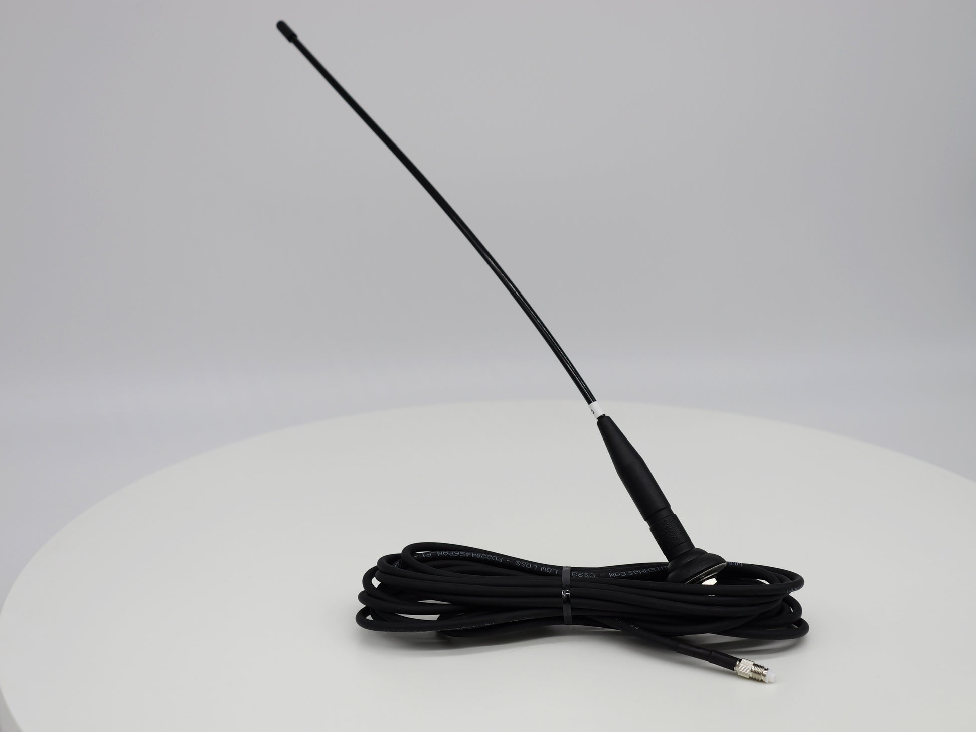 Die Antenne eignet sich ideal für die Montage auf Kunststoffoberflächen (z. B. auf einem UTV oder ATV), da sie gegengewichtsfrei ist. Das CS23 Koaxialkabel, 5m, endet mit einer FME-Buchse. Strahler Länge: 42cm