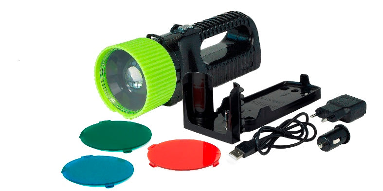 • Lieferumfang: inkl. Ladestation, Ladekabel (100-240V, 12/24 V, USB) und 3 Farbscheiben (rot, grün, blau)