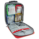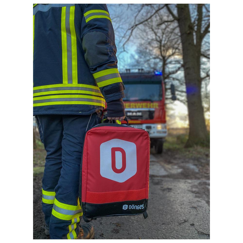 Der Inhalt des Feuerwehrverbandkastens nach DIN 14142-K verstaut im Dönges SEG-Rucksack. Ideal, wenn nur wenig Platz zur Verfügung steht. Im Korpus können Innentaschen verschiedener Größen eingeklettet werden (vier Innentaschen sind im Lieferumfang enthalten!). Im Deckel ist Platz für Dokumentation und Kleinmaterial. Sogar ein Ampullarium für