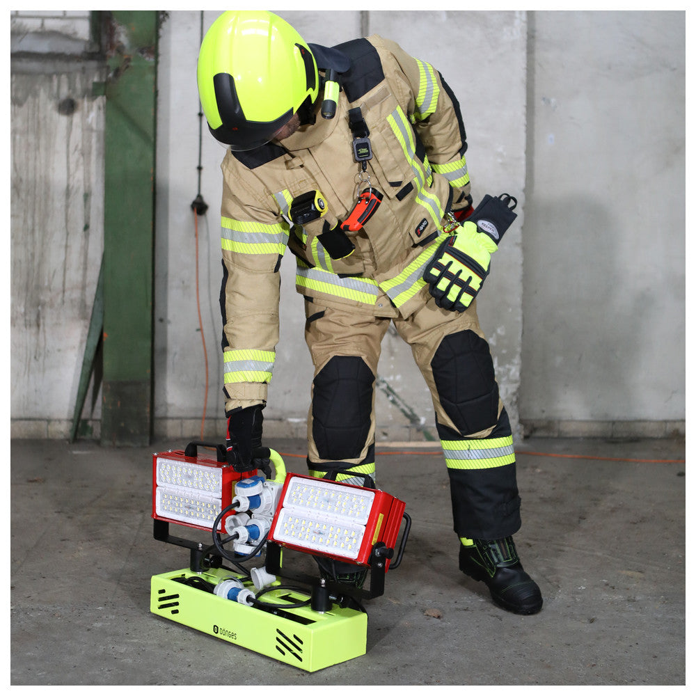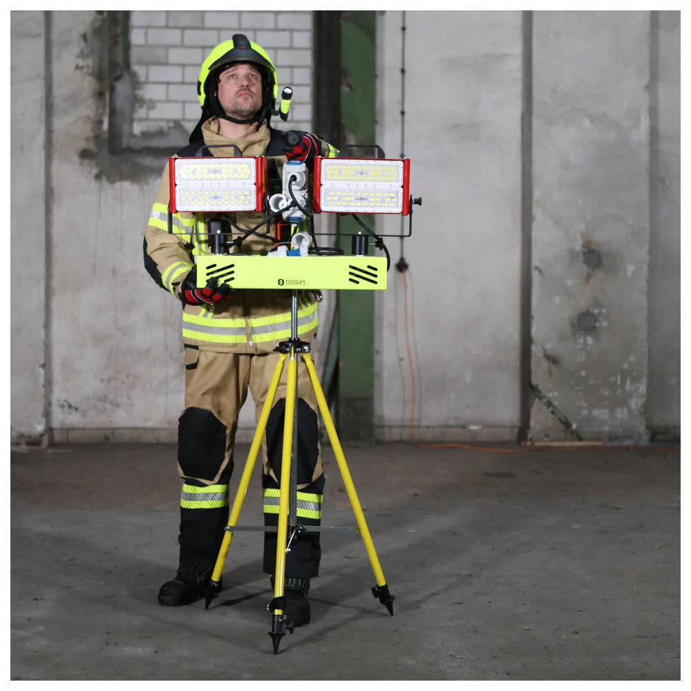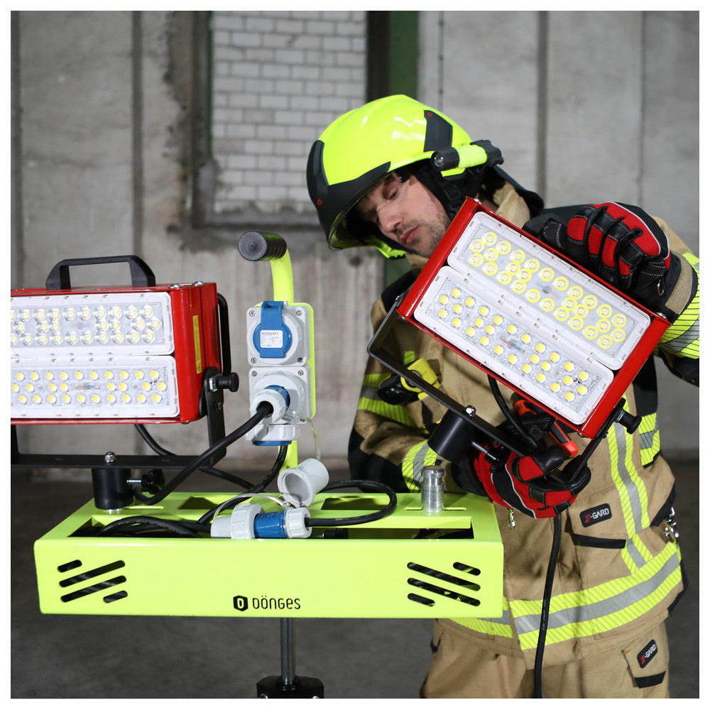 Die Dönges-Scheinwerfertrage dient zum schnellen Ausleuchten einer Einsatzstelle und lässt sich auf jedem Stativ mit DIN-Zapfen aufsetzen. Da kein weiterer Aufbau erforderlich ist, verringert sich der Aufwand gegenüber einem System mit Scheinwerferbrücke erheblich.