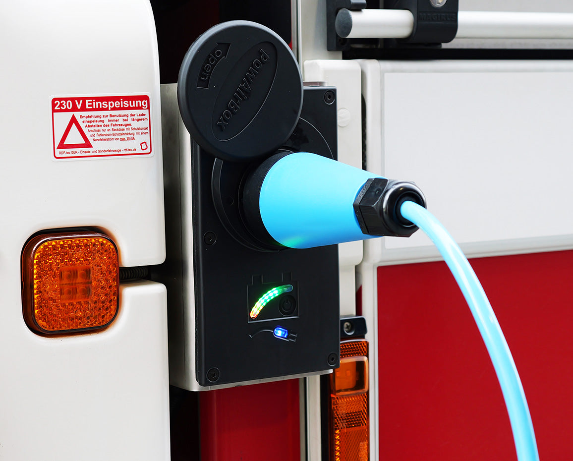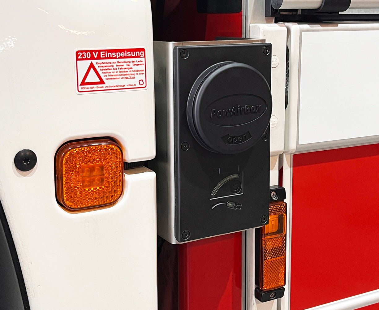 Die PowAirBox II ist ein System zur Strom- sowie Drucklufteinspeisung für Einsatzfahrzeuge mit automatischem Auswurf.